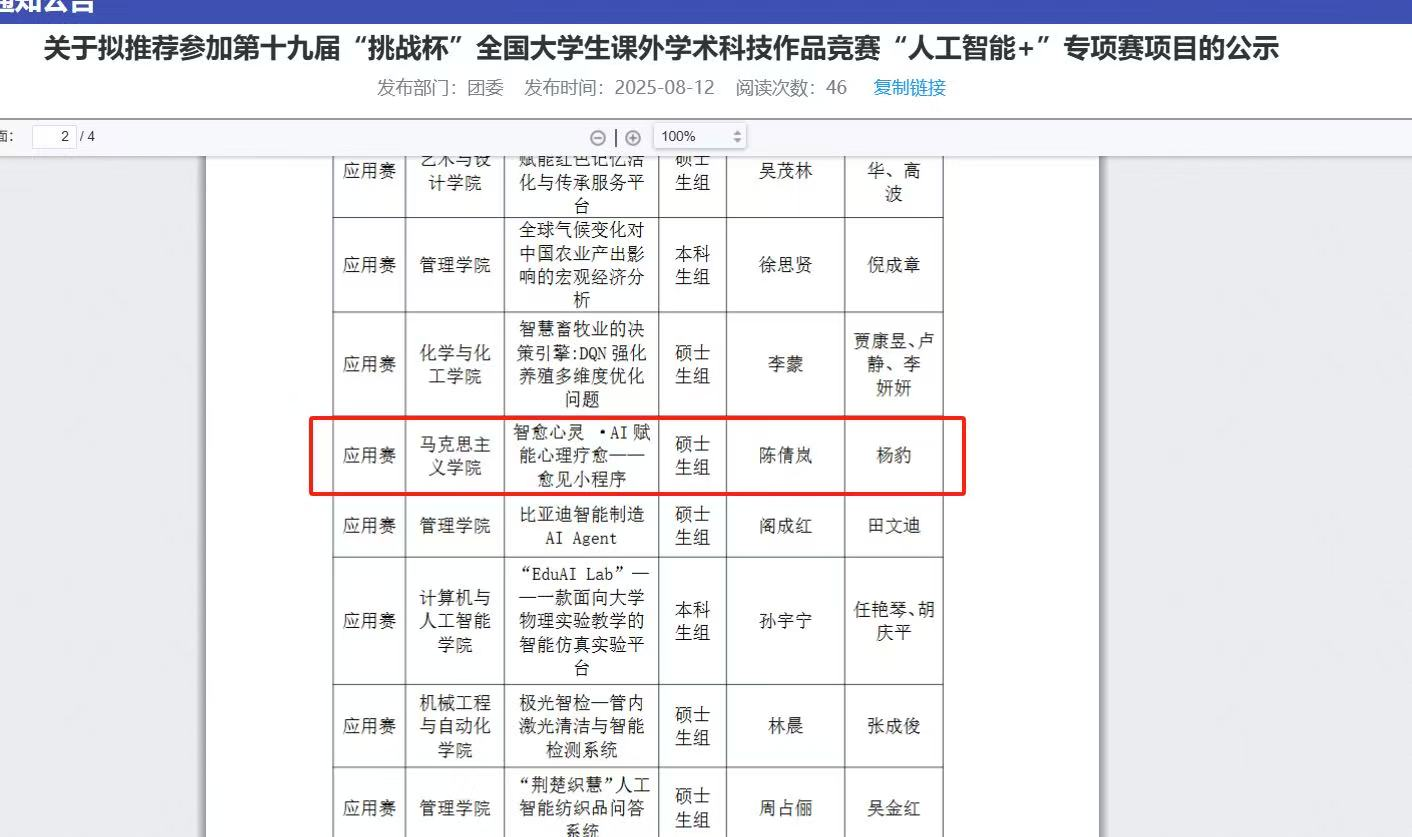 近日,从第十九届“挑战杯”全国大学生课外学术科技作品竞赛“人工智能+”专项赛道传来喜讯,suncitygroup太阳集团网址陈倩岚同学的团队项目“智愈心灵。AI赋能心理疗愈—愈见小程序”在院赛中荣获一等奖,并成功通过校赛选拔,获得推优进入国赛资格。这一创新项目将人工智能技术与心理健康领域深度融合,展现了科技赋能社会福祉的无限可能。
