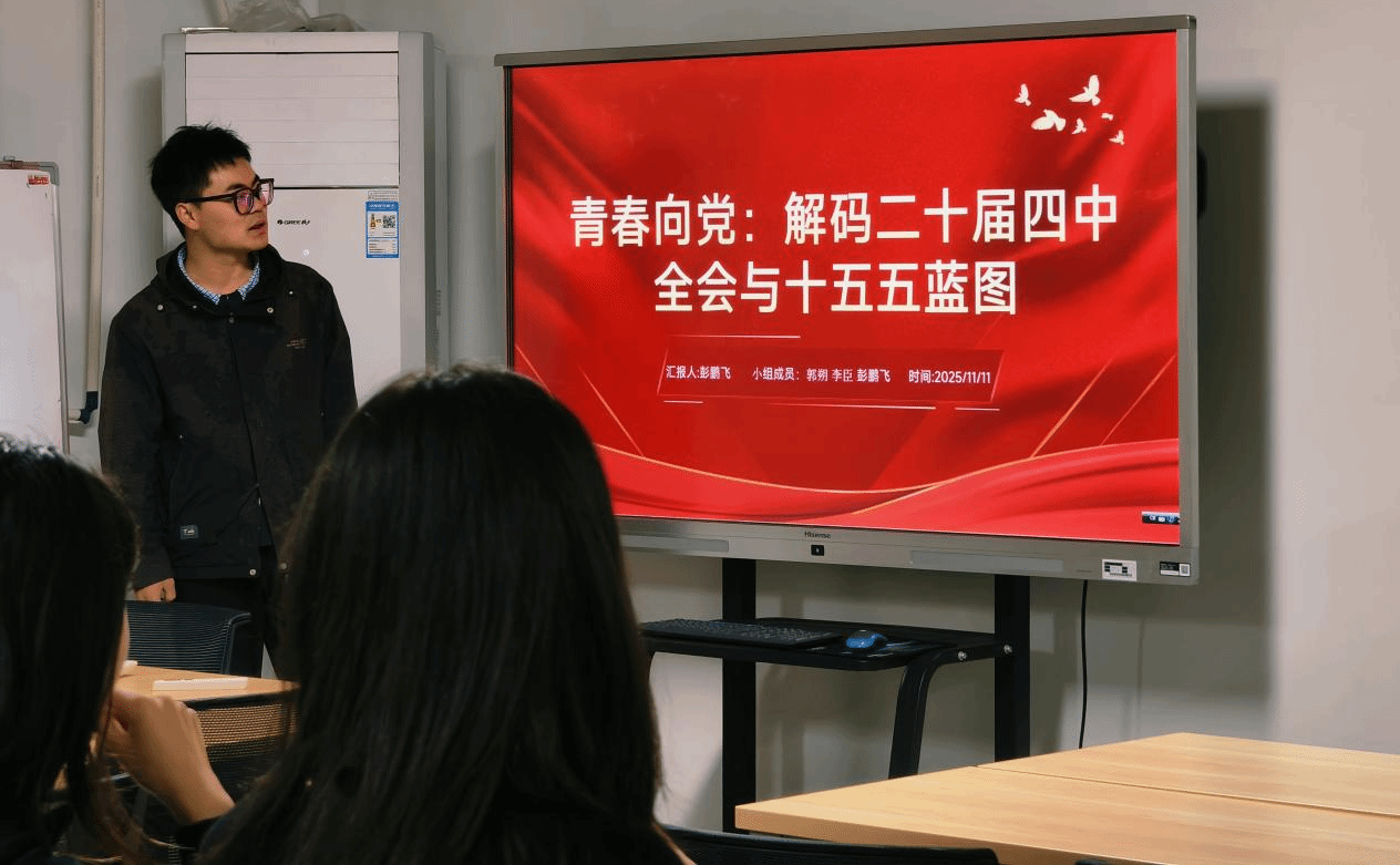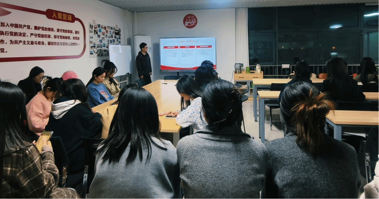 为深入贯彻党的二十届四中全会精神,引导青年学生准确把握国家发展蓝图,11月11日晚,suncitygroup太阳集团网址团支部在阳光校区15栋学生宿舍“一站式”党建共享社区举办11月主题团课。本次团课由团支部成员彭鹏飞同学主持,学院全体团员积极参加。